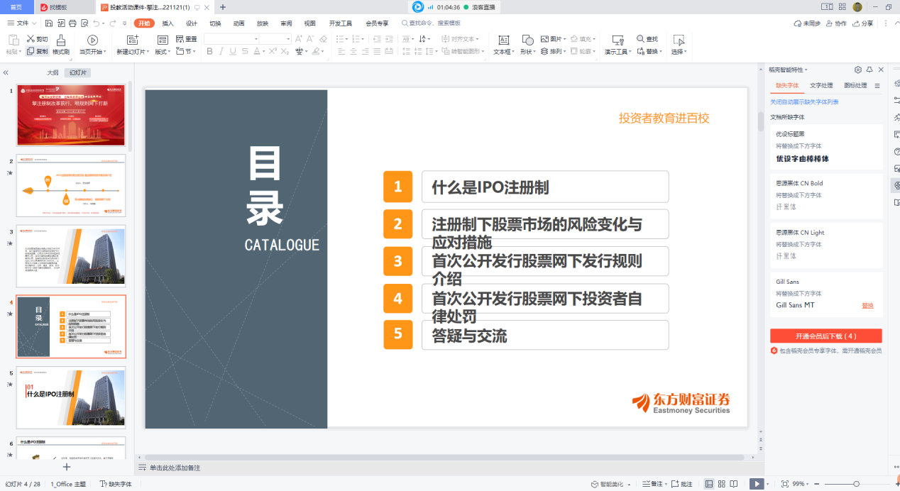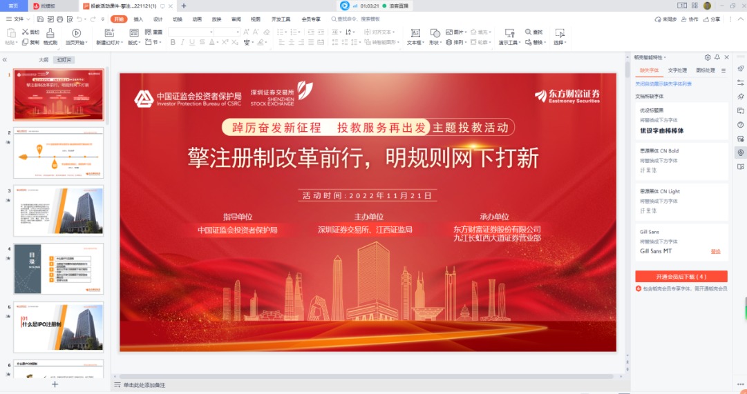 为巩固学生群体金融知识体系、拓展学生群体视野,2022年11月21日东方财富证券投资者教育基地走进江西财经职业学院,举办了“投资者教育进百校——擎注册制改革前行,明规则网下打新”主题投教活动,活动由东方财富证券九江长虹西大道证券营业部承办。根据九江市疫情防控及校方要求,宣讲活动以线上直播的方式进行,共130位学生参与,直播人气4.40万。