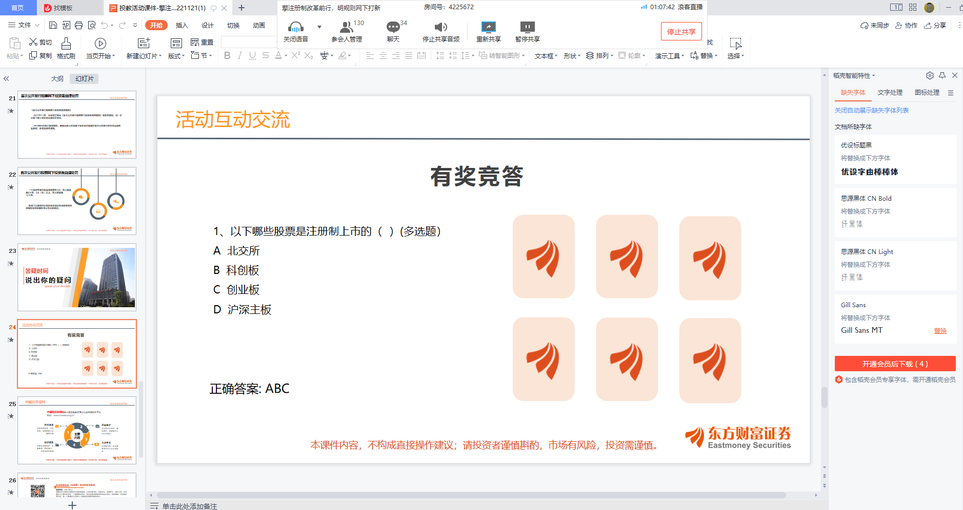 最后是答疑环节及介绍东方财富证券投资者教育基地,讲师告知同学们关注东方财富证券投资者教育基地网站的内容,可获取海量的学习资源和金融知识,帮助学生树立正确的投资观。为了加深同学们的印象,讲师像往常一样带着同学们简要地回顾了各个部门的核心内容和思路。
