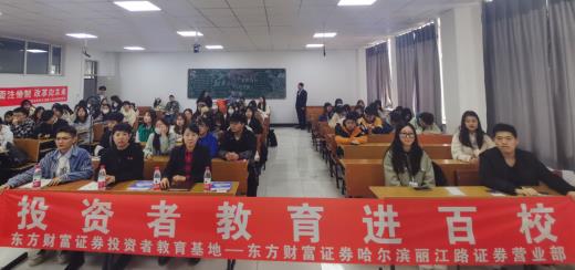 为积极响应中国证监会、中国证券业协会“推动投资者教育纳入国民教育体系”的号召,履行“投资者教育进百校”的行动倡议,增强在校学生对证券市场的正确认识,普及金融知识,提高学生金融素养,东方财富证券哈尔滨丽江路证券营业部联合哈尔滨远东理工学院于2023年4月19日举办了“掌握股票基础知识,提高学生金融素养”为主题的投资者教育进百校活动。